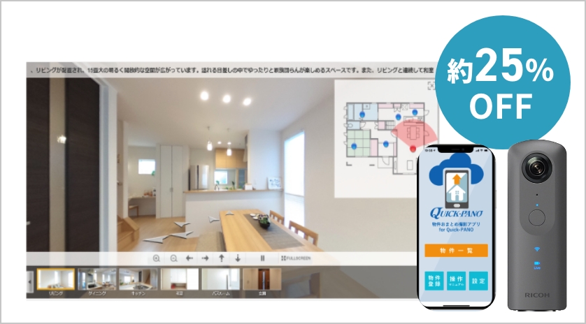 リアルに伝えるQuick-Pano。「Quick-Pano」は、360°カメラで撮影した画像をアップロードするだけで、手軽にパノラマビューを生成できるWebサービスです。高価な機材や専門スタッフを必要とせず、安価に導入が可能。自社サイトやポータル掲載にすぐ活用でき、モデルルームや物件の魅力をリアルに伝えます。誰でも簡単に導入できる、営業現場の即戦力ツールです。